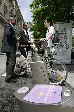 13日,法國巴黎市政廳工作人員在街頭展示“自助自行車”。為了鼓勵更多市民采取環保的交通方式出行,到7月15日,將有10648輛自行車被投放到巴黎的750個車站。租借這些自行車的人們可以在其他車站還車,非常方便。