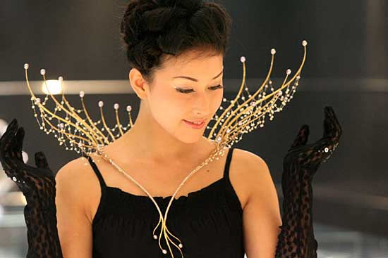6月12日,在濟南舉辦的“齊魯精品珍珠展”上,模特展示一款名為“璀璨之夜”的立體造型珍珠項鏈。這款珍珠項鏈由18K金和456顆天然珍珠打造而成,造型華貴、別具風情。