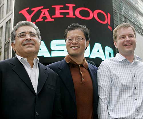 美國著名網絡搜索公司“雅虎”6月18日宣布重大高層變動,原任董事長兼首席執行官的特里·塞梅爾辭去首席執行官職務,公司創始人之一、美籍華人楊致遠出任首席執行官,從而重掌雅虎門戶。這張2005年3月2日拍攝的資料照片顯示,楊致遠(中)與塞梅爾(左)以及“雅虎”公司另一創始人菲洛在美國時報廣場合影。