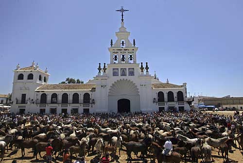26日,在西班牙南部瓜達爾基維爾河口地區的埃爾羅西奧,人們在“驅趕母馬”活動上將眾多母馬匯集到一起。瓜達爾基維爾河口地帶是西班牙南部著名的養馬地。每年6月26日,牧人們都要舉行“驅趕母馬”活動,將放養在河口地區多尼亞納國家公園里的母馬先集中到埃爾羅西奧,再集體趕往附近的阿爾蒙特參加傳統的牲畜集市。上百匹馬集體行動,場面蔚為壯觀。目前,這已經成為當地重要的牧業傳統文化活動。
