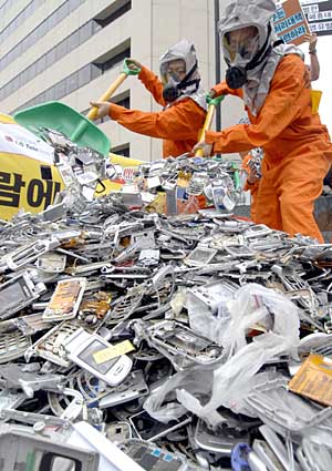 7月3日,在韓國首都首爾情報通信部前,環保主義者用鏟子翻轉廢棄的手機。當日,韓國環保主義者舉行活動,要求對廢棄手機進行妥善處理。