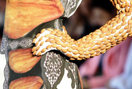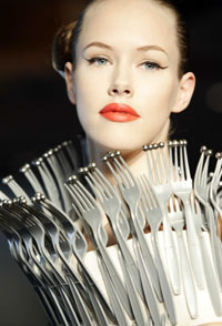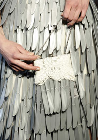 金屬刀叉制成的領飾、提包。