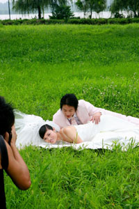7月15日,一對新人在江蘇省盱眙縣淮河沿岸風光帶拍攝婚紗照。