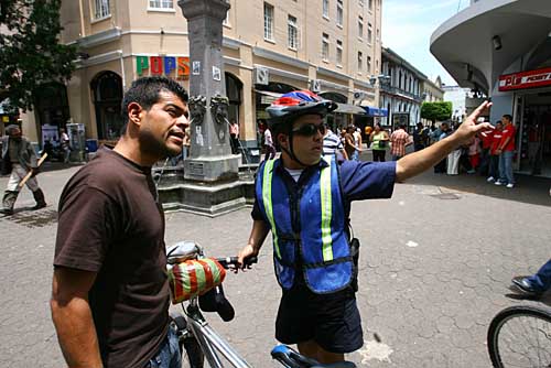 16日,一名騎自行車的哥斯達黎加警察在首都圣何塞市中心的步行街上接受市民咨詢。哥斯達黎加是世界上少數沒有軍隊的國家之一,其警察部隊有數萬人,擔負著國家的社會治安和邊境安全等任務。