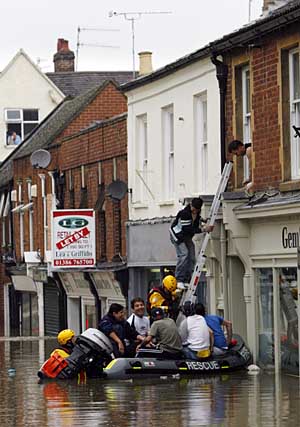 21日,救援人員在英格蘭中部的伊夫舍姆救助受困的居民。英格蘭西部、中部和南部以及威爾士的許多地區20日和21日遭受暴雨襲擊,成千上萬的房屋被淹,居民或被迫撤離家園,或被洪水圍困在家中,還有許多人被困在嚴重堵塞的公路上,F在,英國全國仍有16個地方處于洪水緊急警報狀態,70多個地方處于一般洪水警報狀態。