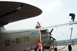 7月16日,焦作市森防工作人員在為農用飛機裝添農藥。近日,河南省焦作市25萬畝農田防護林發生嚴重蟲害。當地政府緊急租用2架農用飛機,噴灑農藥滅殺森林害蟲。