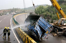 7月24日,搶險人員為事故車輛噴水降溫。當日8時40分許,一輛運輸化學品的貨車在山西境內運(城)三(門峽)高速公路8公里處側翻,車上運輸的數噸碳氨水泄漏。事故發生后,運三高速公路交警、運城消防支隊官兵迅速趕到現場搶險救援。運三高速公路緊急封閉1小時30分。