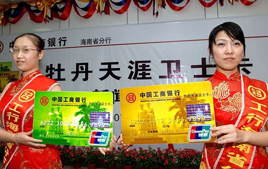 7月30日,工商銀行海南省分行的工作人員展示首張專門為部隊官兵服務的銀行卡--“牡丹天涯衛士信用卡”!鞍艘弧鼻跋,一款專門為部隊官兵提供金融服務的銀聯標準信用卡--“牡丹天涯衛士信用卡”在海南面世,這是我國第一張專門為部隊官兵提供服務的銀行卡。它是工商銀行海南省分行專門為駐守海南的各部隊官兵及武警官兵提供的一項獨到的、個性化服務產品。除具有信用消費、存取現金、電子銀行等先進的服務功能外,部隊官兵還能在執行任務時隨時變動透支額度,滿足應急要求。