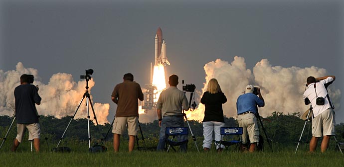 8日,攝影記者在美國佛羅里達州肯尼迪航天中心附近拍攝“奮進”號航天飛機發射升空的鏡頭。美國東部時間18時36分(北京時間9日6時36分),美國“奮進”號航天飛機載著機組7名宇航員從佛羅里達州肯尼迪航天中心發射升空,飛往國際空間站。這是“奮進”號時隔近5年來,首次執行飛行任務。