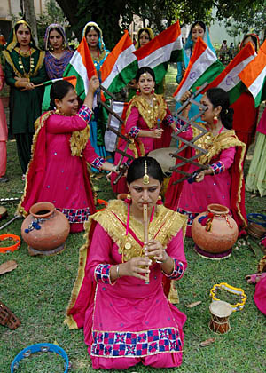 11日,在印度旁遮普邦的阿姆利則市,年輕的印度姑娘們載歌載舞參加獨立日慶典彩排。印度將于8月15日迎來第60個獨立日。