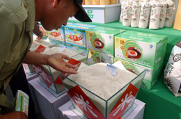 8月8日,黑龍江省慶安縣農特產品展銷會上,一位中年人在查看散裝大米。當日,兩年一度的綠色食品節在黑龍江省綏化市慶安縣拉開帷幕。綠色食品節期間舉行了農特產品展銷會,數萬人穿梭于展銷街上了解商品行情,不少農戶還借機尋找發展商機。