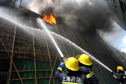 8月16日,上海消防人員在黃浦體育館滅火。當天上午10點25分許,上海黃浦體育館突發大火,三至四樓的竹制腳手架大面積燃燒,當時許多工人被困其中。10點30分,兩輛消防車趕到現場,10分鐘后火勢得到控制。事故原因及具體損失情況還在調查中。
