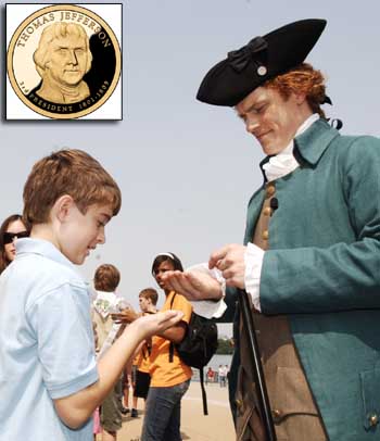 15日,在美國華盛頓的杰斐遜紀念堂前舉行的一美元杰斐遜“總統硬幣”發行儀式上,一名裝扮成杰斐遜的演員(右)向參加儀式的孩子們贈送杰斐遜“總統硬幣”。美國總統布什去年簽署法案,規定美國鑄幣局從今年開始鑄造鐫有去世兩年以上的美國總統頭像的一美元硬幣,按總統任職先后順序,每三個月發行一次,每年發行四種。左上角小圖為一美元杰斐遜“總統硬幣”的正面圖案。