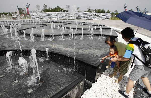 市民在水形噴水池邊戲水。順義奧林匹克水上公園不僅有64萬平方米的水面和近180萬立方米的水體,更布滿了與水有關的元素,如船形看臺、波浪形艇庫、槳橋、路燈等,這些設計理念無不來源于水,成為2008年奧運會賽艇、皮劃艇、游泳公開水域賽場的亮點。