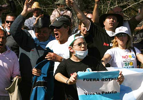 2日,在烏拉圭河東岸的烏邊境城市弗賴本托斯市,阿根廷民眾抗議烏拉圭在該地區興建造紙廠。烏拉圭政府于2005年批準一家芬蘭公司在與阿根廷交界的弗賴本托斯興建一座造紙廠。阿政府認為,造紙廠勢必會對阿邊境地區的生態環境、居民生活和旅游業構成威脅,并要求烏方停止建廠。雖然烏拉圭和阿根廷兩國政府代表團就此問題進行過技術性會談,但沒有取得實質性進展。