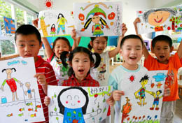 9月8日,幾名蘇州教育幼兒園大班的孩子展示自己創作的繪畫。