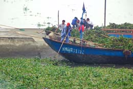 9月9日,工作人員正在打撈錢塘江里的水葫蘆。