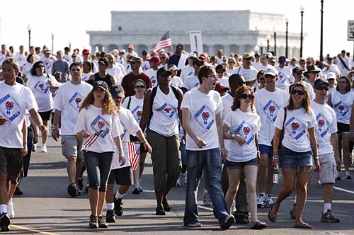 9日,在美國首都華盛頓,人們在參加紀念“9·11”6周年千人游行集會。當天,數千名來自美國各地的人們從華盛頓的林肯紀念堂步行至五角大樓,紀念“9·11”6周年。