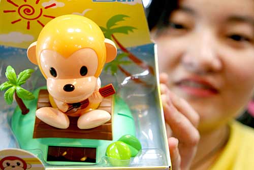 在安徽省淮北市一家商店,一位工作人員展示太陽能玩具。這種太陽能玩具的底座設有光線接收口,可以將陽光、燈光的光能轉換為電能,玩具會頻頻點頭,十分可愛,頗受消費者喜愛。