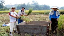 10月6日,兩位香港游客在婺源鄉間的稻田里體驗收割稻谷農事活動!笆弧秉S金周,江西婺源優美的田園風光和淳樸民風民俗引來眾多中外游客,綠色環保的鄉村游深受游客青睞。