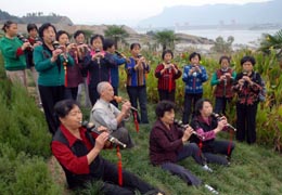 10月9日,湖北省秭歸縣一些移民在三峽壩前公園里學習演奏葫蘆絲。秭歸縣是三峽庫區移民人數較多的縣,動態移民達10萬人。移民搬遷后,縣里成立舞蹈隊、樂器演奏隊、健身隊等,以多種多樣的休閑活動豐富移民生活。