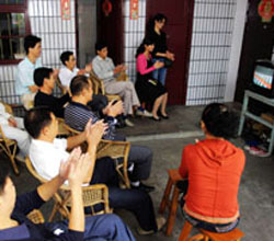 洪田村村民在收看十七大開幕盛況(10月15日攝)。