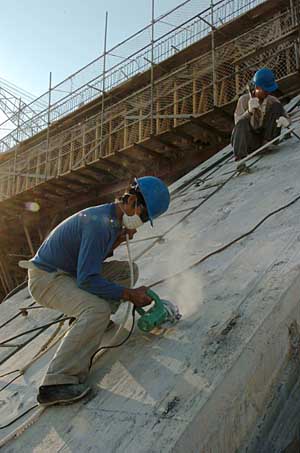 22日,兩名中國工人在蘇丹首都喀土穆以北的麥羅維大壩施工現場施工。麥羅維大壩位于喀土穆以北約450公里處的尼羅河上,由中國水利電力對外公司和中國水利水電建設集團公司承建,是迄今為止中國企業承包的最大國際工程,也是蘇丹乃至非洲目前在建的最大水電項目。大壩于2003年7月開工,預期2008年完工。