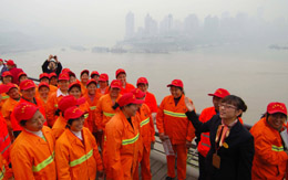11月4日,農民工們在重慶南濱路上聽導游(右二)介紹遠處的朝天門廣場。當日,重慶市舉辦“萬名農民工喜看重慶建設成就活動”,邀請一萬多名來自重慶市各區縣的農民工代表參加主城區“一日游”。
