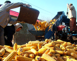 10月29日,海林市江北村村民給玉米脫粒。黑龍江省海林市是全國綠色食品原料(水稻、玉米、大豆)標準化生產基地,目前該基地種植的80萬畝水稻、玉米、大豆等農作物喜獲豐收。