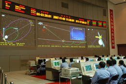 11月5日,科技人員在北京航天飛行控制中心指控大廳內精心操作。當日11時37分,北京航天飛行控制中心對嫦娥一號衛星成功實施第一次近月制動,順利完成第一次“太空剎車”動作。衛星被月球捕獲,進入環月軌道,成為我國第一顆月球衛星。