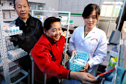 11月5日,城市低保戶王西寧(中)在銀川興慶區錦繡苑社區醫療救助點免費取藥。