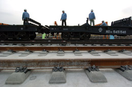 11月13日,中鐵二局施工車輛在為京津城際快速鐵路鋪軌。