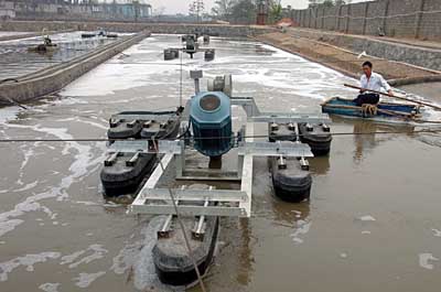 廣西來賓一企業的技術人員在污水處理池內檢查設備運轉情況(11月14日攝)。