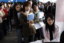 11月20日,畢業生在用人單位招聘攤位前洽談、應聘。當日,江蘇省暨南京市2008屆普通高校畢業生公益供需洽談會在南京國際展覽中心舉行,900多家用人單位提供2.5萬多個職位,通過江蘇省高校畢業生就業網與用人單位對接、匹配而篩選出的五萬多名畢業生免費入場應聘。江蘇省2008屆普通高校畢業生達42.7萬人,比2007年增加七萬多人,畢業生人數再創歷史新高。