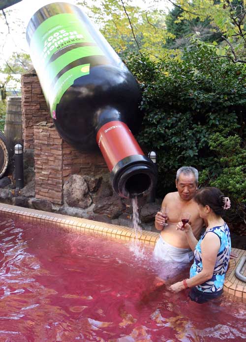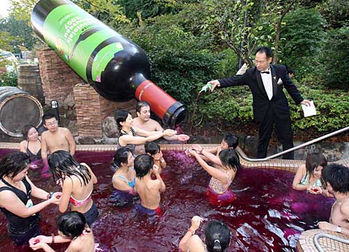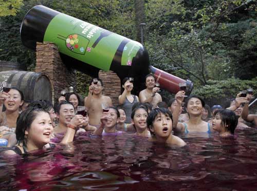 人們在日本箱根享受葡萄酒浴,慶!安┤羧R”鮮葡萄酒開瓶日。 11月的第三個星期四,是一年一度的“博若萊”鮮葡萄酒開瓶日!安┤羧R”鮮葡萄酒是葡萄酒愛好者能喝到的法國當年第一款新酒,品嘗該酒可以對法國當年葡萄酒的品質和年景有基本判斷,因此,具有法國葡萄酒“年景評估尺”的美譽!安┤羧R”鮮葡萄酒深受日本人的歡迎,今年約進口840萬瓶。