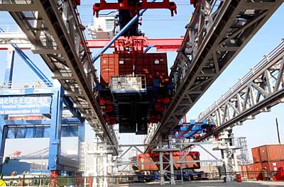 11月24日,由上海振華港機集團自主研發制造的立體分配式高效集裝箱自動化碼頭裝卸系統,在振華港機長興島基地為國內外專家演示。該系統全部采用自動化操作,大大提高了標準集裝箱的裝卸效率。這是起吊的集裝箱由無人駕駛軌道車從鋼橋上自動轉到堆場。