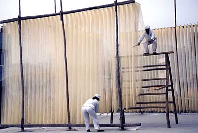 在四川德陽市中江縣永太鎮,兩位身著工作服的村民在曬掛面。