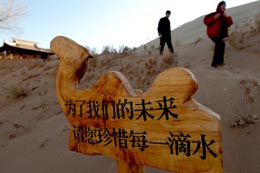 11月29日,幾名游客從月牙泉旁矗立的節水宣傳牌旁走過。