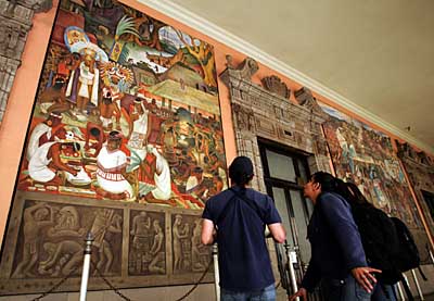 4日,在墨西哥城的國民宮,游人參觀剛剛維修過的墨西哥著名壁畫家迭戈·里維拉創作的反映古代印第安人生活的壁畫。