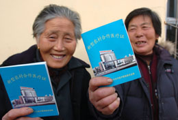 12月12日,山東無棣埕口鎮后埕村村民吳桂華(左)和吳秀芝領到了《新型農村合作醫療證》。