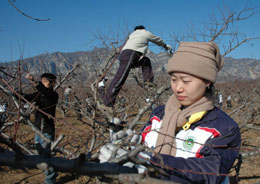 12月13日,河南農業大學林學園藝學院的幾名大學生在果園幫助果農修剪果樹。近日,河南農業大學林學園藝學院的160名本科生和研究生,來到位于太行山腳下的河南省沁陽市紫陵鎮紫陵村萬畝無公害經濟林園區,開展為期一周的社會實踐活動。學生們對當地果農進行技術培訓,并幫助果農對桃樹、杏樹、梨樹進行冬季剪枝管理。