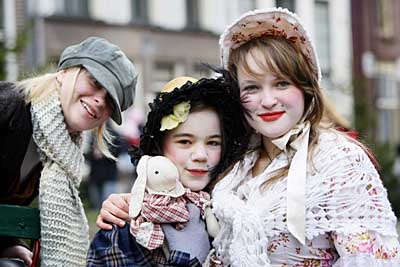 15日,幾名女孩打扮成英國作家查爾斯·狄更斯小說中的人物走在荷蘭代芬特爾的街頭。當天,人們穿上狄更斯筆下人物的服裝參加周末在代芬特爾舉辦的“狄更斯節”。