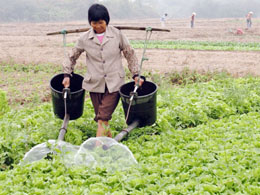 12月16日,廣西欽州市尖山鎮一農婦擔水澆灌受旱菜地。