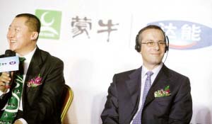 | 2006年12月18日,蒙牛攜手達能成立合資公司,圖為蒙牛集團總裁楊文俊(左)與達能亞太區乳制品總裁顧德和在新聞發布會上。CFP圖片 | 繼10月16日光明乳業(600597)與法國達能集團全面終止合作后,蒙牛乳業(2319.HK)與達能的合資項目也于12月18日宣告終止。分析人士認為,達能與蒙牛分手預示著達能在中國投資策略發生變化。一些達能足夠強大的行業,例如乳品,可以獨立地進入新興市場,不一定要通過合資企業。