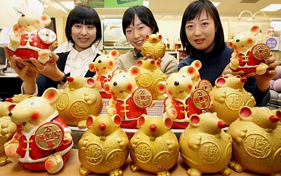 2008年1月1日,在韓國首都首爾的一家商場,售貨員展示老鼠造型的存錢罐。2008年是農歷鼠年,韓國商家借機推出了各種老鼠造型的用品。