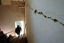 江西省上饒縣商貿大市場2002年建成后交付使用。但300多戶居民入住僅數月,就發現房屋出現嚴重質量問題。經江西省贛坤建筑工程司法鑒定所鑒定,這個市場屬于必須整改的嚴重危房。上饒縣有關部門2004年責成有關開發商限期進行整改,但時至今日,由于開發商多次逃避和推卸責任,相關部門沒有及時督促,市場仍未進行整改,300多戶居民在危房中心驚膽戰地度過了六年。圖為業主周田賓的商品房主梁已出現大裂縫。