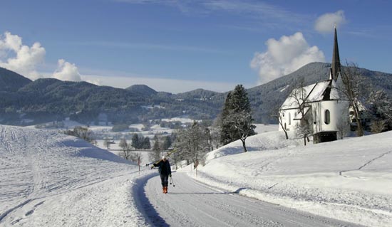 1月1日,在德國南部城鎮加米施-帕滕基興附近,一名行人在白雪皚皚的路間行走。當日,德國一些地區降下2008年的第一場雪。