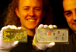 北京2008年奧運會五福賀歲金、銀條將于1月8日在北京上市銷售!拔甯YR歲金、銀條”由北京奧組委授權、中國印鈔造幣總公司制造發行、中鈔國鼎投資有限公司總經銷!拔甯YR歲金條”規格分別為50克、100克、500克和1000克四種;“五福賀歲銀條”規格分別為50克、100克和1000克三種。