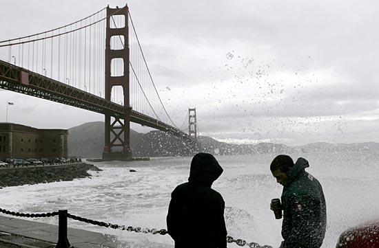 5日,在美國加利福尼亞州的舊金山,兩名男子站在金門大橋旁的岸邊上?耧L、暴雨和大雪4日至5日席卷加利福尼亞州,導致一些地區面臨洪水和泥石流威脅。