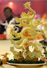 12月20日,參觀者在觀看宿遷餐飲展位上的食品雕刻。當日,江蘇省第二屆餐飲業成果展暨第五屆烹飪技術比賽在南京城市規劃建設展覽館開幕,全省各地的餐飲展位以及數百個參賽團體和單項選手制作的創新菜肴,讓參觀者享受到一場豐盛的美食“盛宴”。